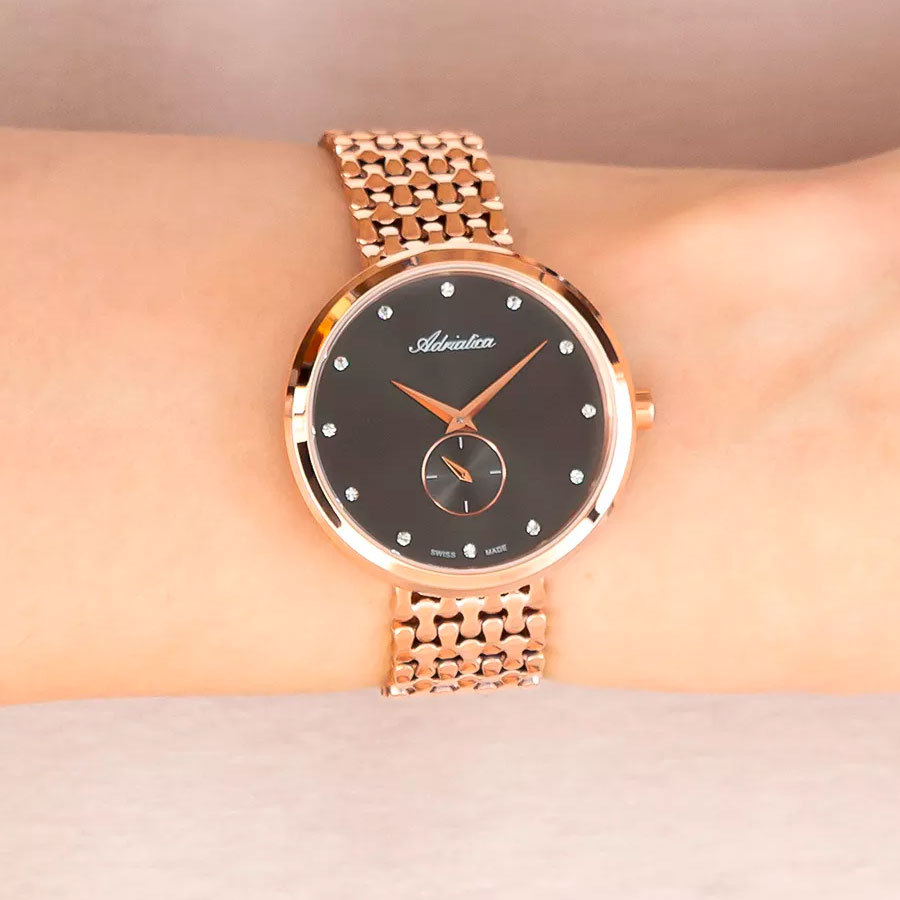 Корпус: Круглый корпус выполнен из полированной нержавеющей стали с розовым PVD покрытием золотом. Чёрный циферблат выполнен по технологии Sunray (солнечные лучи) и украшен 12 кристаллами. Накладные часовые индексы и стрелки выполнены из позолоченной стали. Минеральное стекло. Диаметр корпуса составляет 34 мм, толщина 7 мм. Водостойкость WR 30 (мытье рук, дождь).