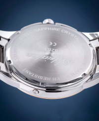 Корпус: Круглый корпус выполнен из полированной нержавеющей стали. Серебристый циферблат. Накладные часовые индексы и стрелки выполнены из стали с покрытием SuperLuminova, которое обеспечивает подсветку в темное время суток. Минеральное стекло. Диаметр корпуса составляет 42 мм, толщина 8 мм. Водостойкость WR 50 (мытье рук, дождь).