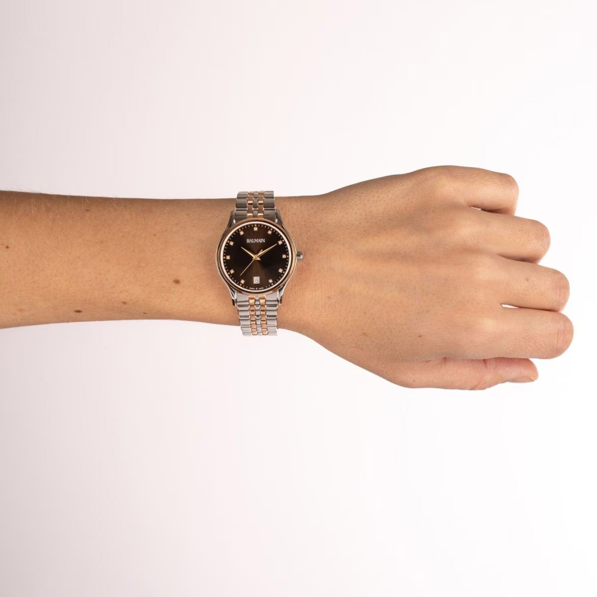 Корпус: Корпус из нержавеющей стали c частичным PVD - покрытием розового золота, поверхность с полировкой до зеркального блеска. Циферблат шоколадного оттенка украшен 11 бриллиантами Top Wesselton VS-SI общим весом 0,041 карата. Часовые индексы и стрелки выполнены из стали с позолотой. Сапфировое стекло, устойчивое к появлению царапин, обладающее высокой прозрачностью. Диаметр корпуса составляет 32 мм. Водонепроницаемость: 30 м.