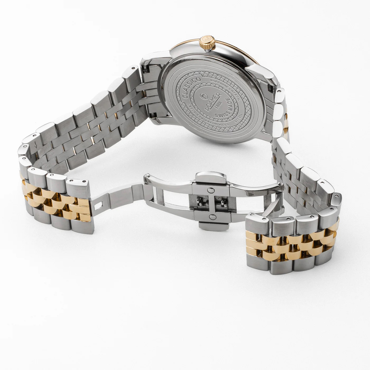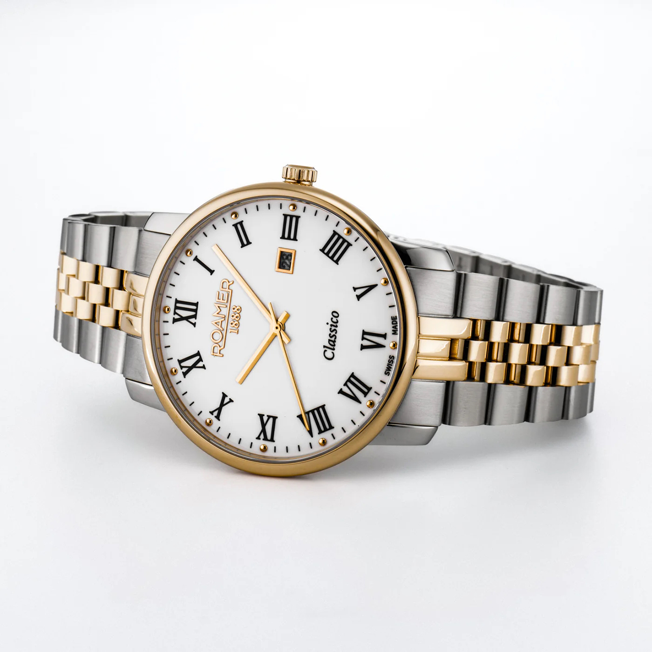 Корпус: Высококачественная нержавеющая сталь, марки 316L с частичным IP покрытием из жёлтого золота. Белый циферблат. Позолоченные стрелки и чёрные римские цифры. Сапфировое стекло с антибликовым покрытием. Рифлёная заводная головка с логотипом марки «Roamer». Диаметр: 40 мм. Водонепроницаемость: 30 м.