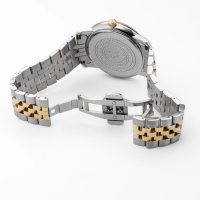 Ремешок: Браслет из высококачественной нержавеющей стали с повышенной устойчивостью к коррозии, поверхности с матовой шлифовкой – сатинированием и полировкой до зеркального блеска с частичным IP покрытием из жёлтого золота. Раскладывающаяся стальная застежка "бабочка" .