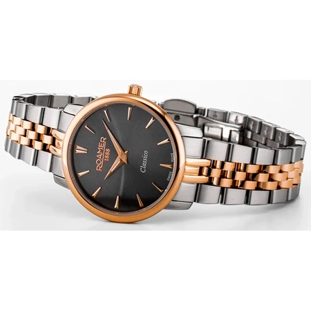 Корпус: Высококачественная нержавеющая сталь, марки 316L с частичным IP покрытием из розового золота. Серый циферблат. Позолоченные стрелки и часовые индексы. Сапфировое стекло с антибликовым покрытием. Рифлёная заводная головка с логотипом марки «Roamer». Диаметр: 30 мм. Водонепроницаемость: 30 м.