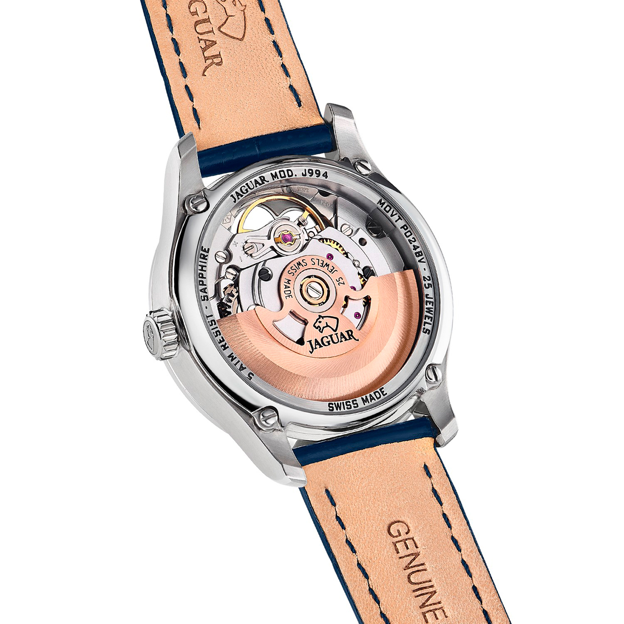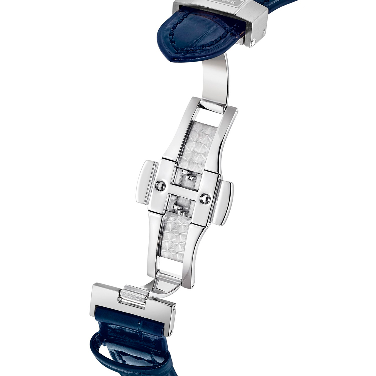 Ремешок: Синий кожаный ремешок с оттиском «под аллигатора». Раскладывающаяся застежка с двойной кнопочной застежкой, с гравировкой эмблемы марки.