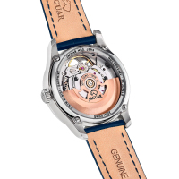 Механизм: Швейцарский автоматический калибр Soprod P024 с ротором цвета розового золота, видимый с оборотной стороны часов.