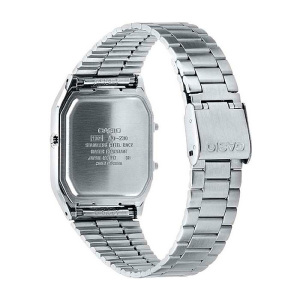 Корпус: Корпус часов выполнен из пластика с хромированным покрытием. Циферблат чёрного цвета вокруг дисплея. Дисплей серого цвета, цифры чёрного. Акриловое стекло. Габаритные размеры: 33x29x7 мм. Водозащита: 30м.
