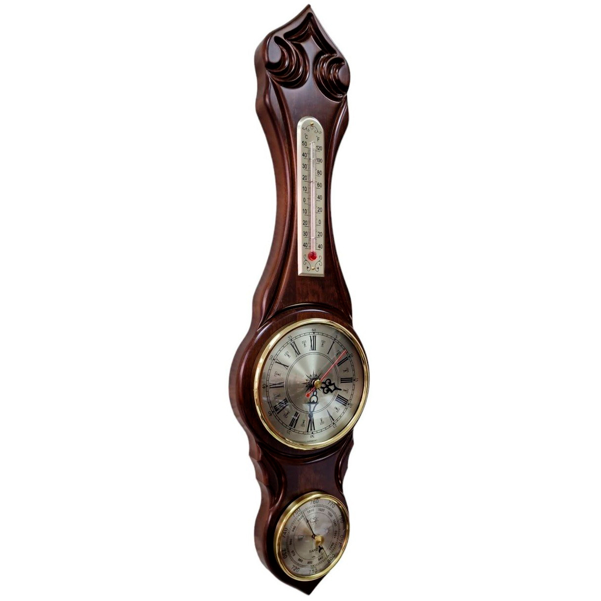 Описание: Метеостанция настенная: барометр, часы, гигрометр и термометр от российской компании "Бриг+", предназначена для измерения атмосферного давления, влажности в помещении, температуры в помещении. Корпус изготовлен из высококачественного массива дерева темно-коричневого цвета, а металлическая фурнитура изготавливается только из полнотелой латуни. Размер 123 x 490 x 35 мм. Использованы механизмы производства Германии, диаметр барометра 46 мм, часов 102 мм, длина термометра 125 мм.