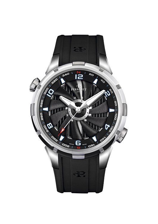 Корпус из матовой нержавеющей стали марки «316L»; неподвижный безель с декоративными каннелюрами и четырьмя зажимами. Циферблат с чёрно-серым полосатым узором, центральными люминесцентными стрелками часов и минут, центральной секундной стрелкой с красно-белым наконечником, люминесцентными арабскими цифрами и часовыми условными индексами; вращающийся чёрный фланец со шкалой «Роза ветров», декоративная чёрная турбина с одиннадцатью лопастями поверх циферблата. Чёрный каучуковый ремешок с логотипом Perrelet, оснащённый классической застёжкой из нержавеющей стали.