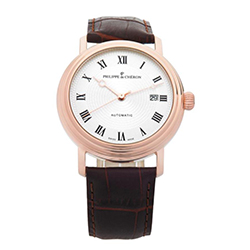1. Philippe de Cheron Templar automatic 1003.2262N Корпус – красное золото 14 карат, общий вес золота – 34,8 г. Диаметр – 41мм, толщина – 9 мм. Сапфировое стекло. Механизм с автоподзаводом «ETA 2824». Циферблат – серебристый, guilloché, золотые стрелки, чёрные римские (I-XII) цифры, окошко даты. Водонепроницаемость 3 атм. (30 м). Коричневый кожаный ремешок. |