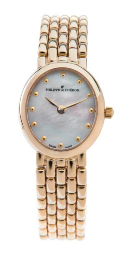 3. Philippe de Cheron Elisa oval quartz 5002.1213N Корпус – жёлтое золото 14 карат, размеры – 21,5x24мм, толщина – 5,5мм. Браслет – жёлтое золото 14 карат. Общий вес золота – 40,2 г. Сапфировое стекло. Водонепроницаемость 3 атм. (30 м). Механизм – кварцевый «Ronda 751». Циферблат – белый, перламутровый, золотые стрелки и часовые метки. |