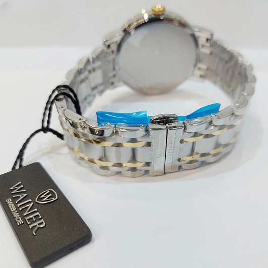 Корпус: Круглый корпус из нержавеющей стали 316L с частичным PVD покрытием. Циферблат зелёного цвета, защищен устойчивым к царапинам сапфировым стеклом и украшен фирменным логотипом Wainer. Тонкие заостренные прямоугольные стрелки. Метки в виде штрихов. Рифленая заводная головка. Диаметр корпуса 44 мм. Водонепроницаемость 50 метров.