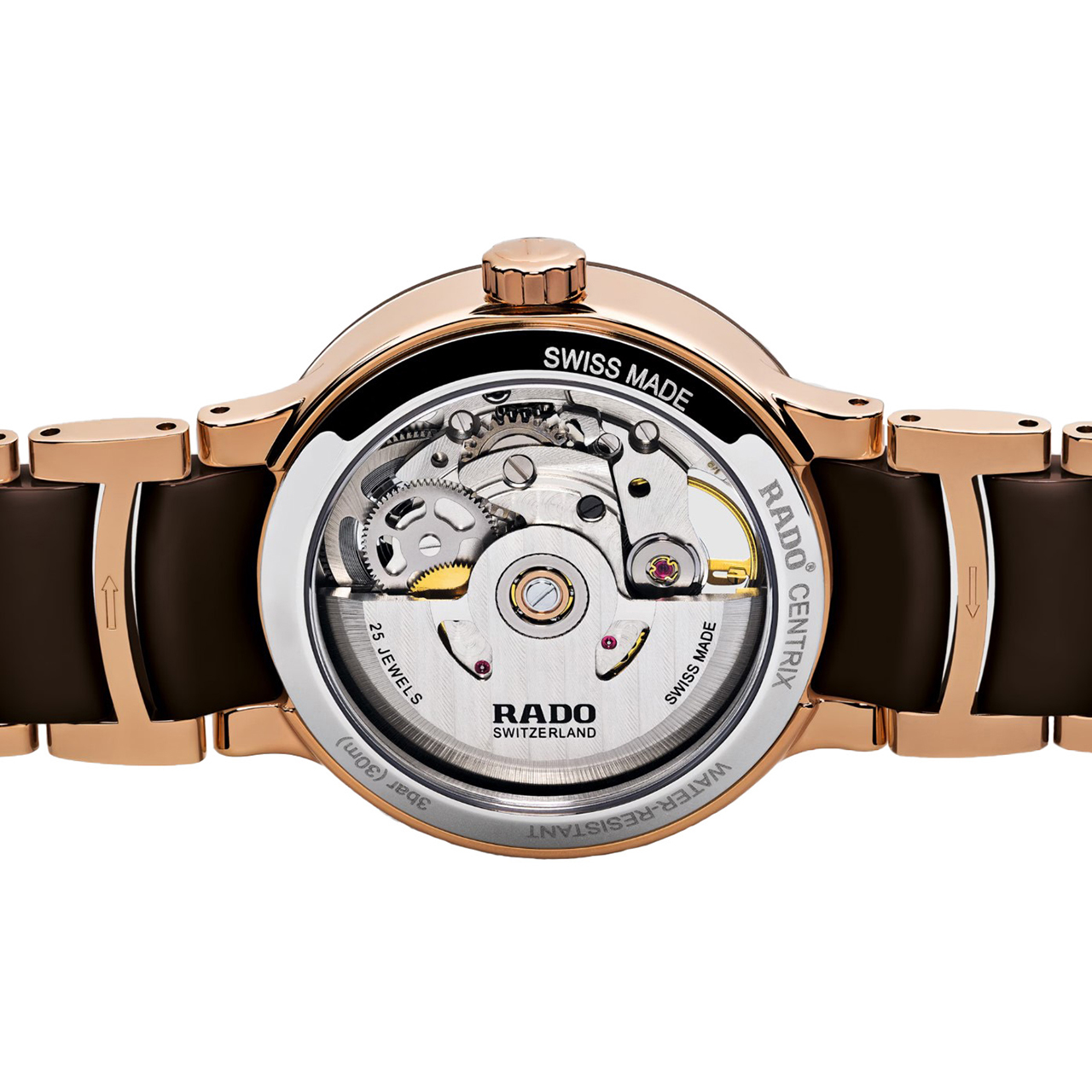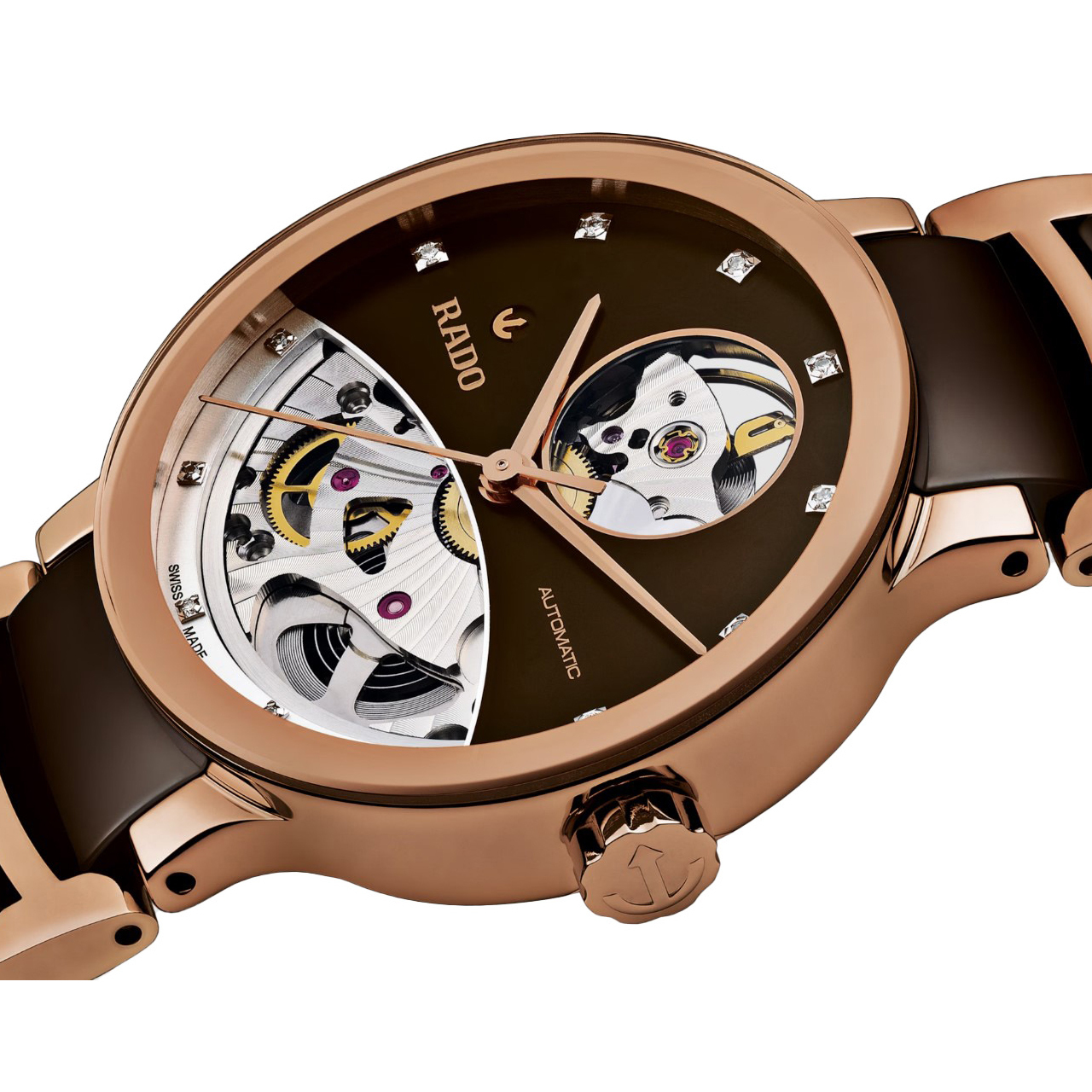 Корпус: Нержавеющая сталь/вакуумное напыление. Крышка корпуса из прозрачного сапфира. Диаметр 33 мм. Водонепроницаемость 30 метров.  Циферблат коричневый, скелетированный. 7 diamonds, 0,027 carat, 5 diamonds, 0,010 carat.