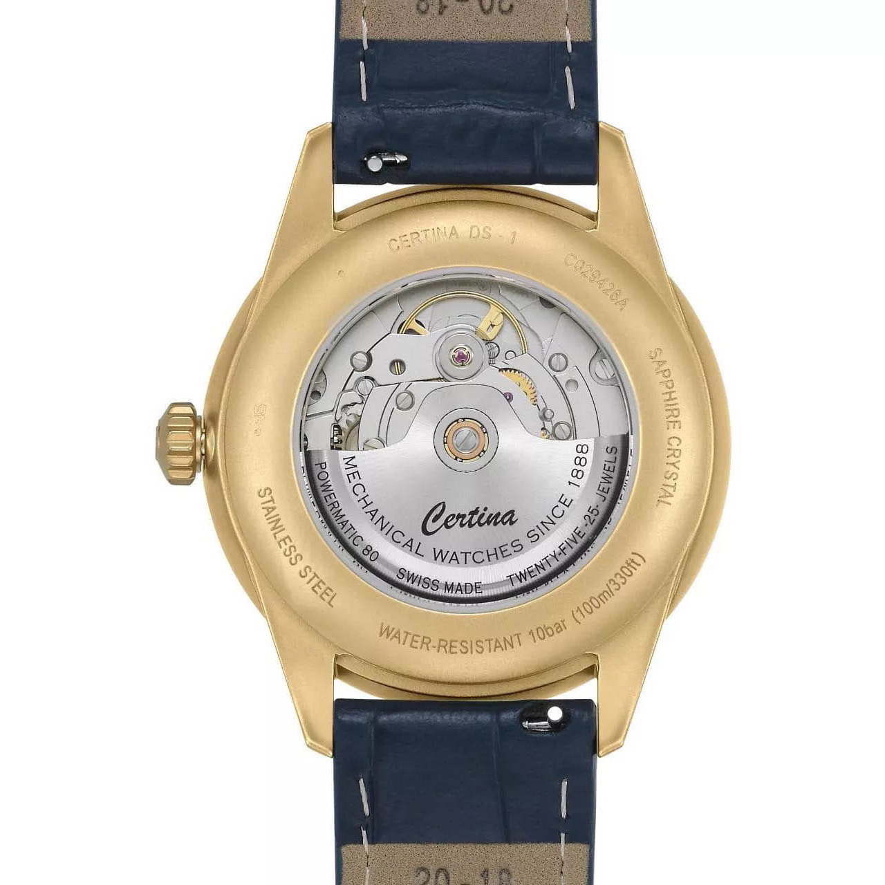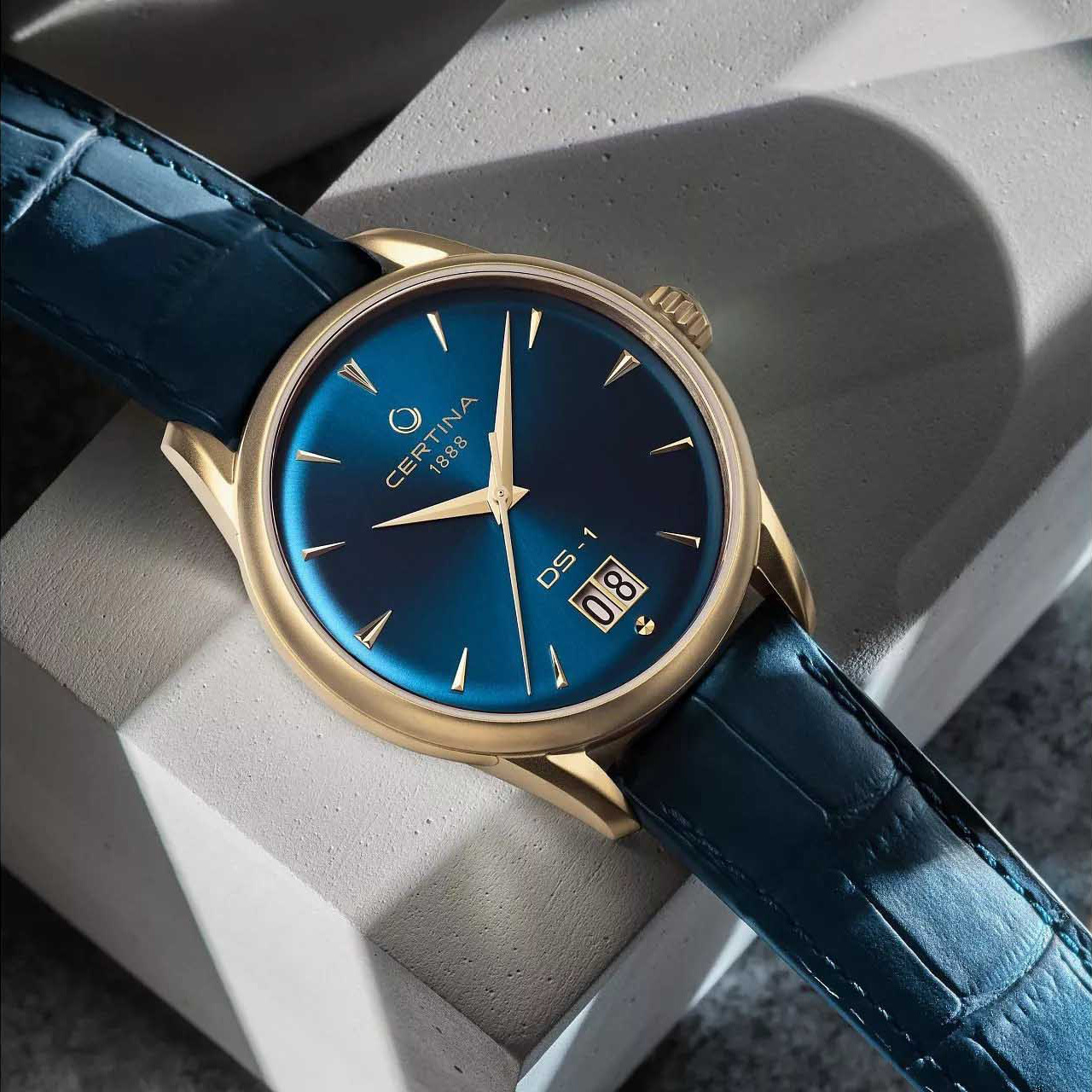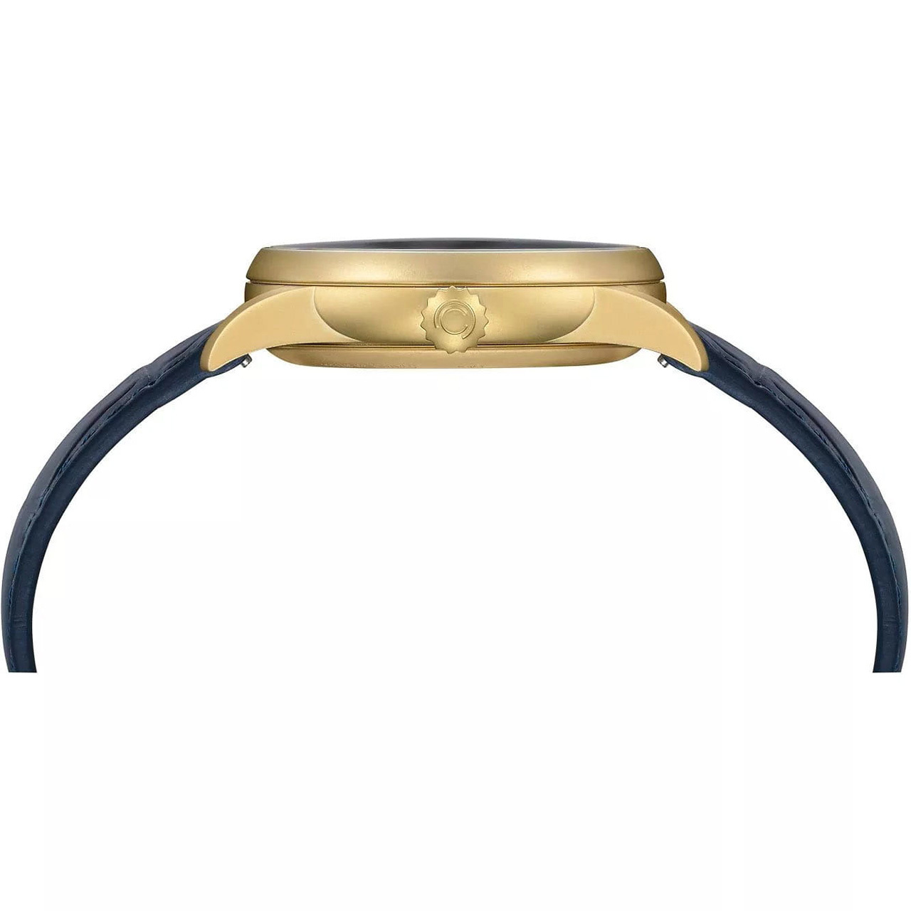 Корпус: Модель выполнена из нержавеющей стали с PVD-покрытием цвета золота, придающим корпусу благородный внешний вид и устойчивость к царапинам. Циферблат синего цвета выполнен в технике sunray, создающей эффект переливающихся лучей, и дополнен золотистыми метками и стрелками. Сапфировое стекло с антибликовым покрытием, устойчивое к повреждениям и обеспечивающее чёткую видимость при любом освещении. Диаметр корпуса составляет 41 мм, толщина — 11 мм. Водонепроницаемость WR 100 (плавание).