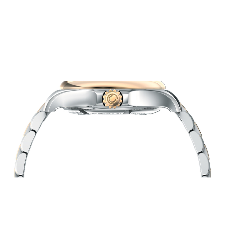 Корпус: Нержавеющая сталь 316L с частичным PVD покрытием. Коричневый циферблат, декорирован 8 бриллиантами Top Wesselton. Стрелки и часовые индексы золотистого цвета. Сапфировое стекло с односторонним антибликовым покрытием. Диаметр 34,5 мм. Водозащита 200 м.