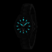 Корпус: Корпус из нержавеющей стали. Сапфировое стекло с антибликовым покрытием. Светлый серебристый циферблат, позолоченные стрелки и часовые индексы. Вращающийся безель. Диаметр 34,3 мм. Водонепроницаемость 300 метров.