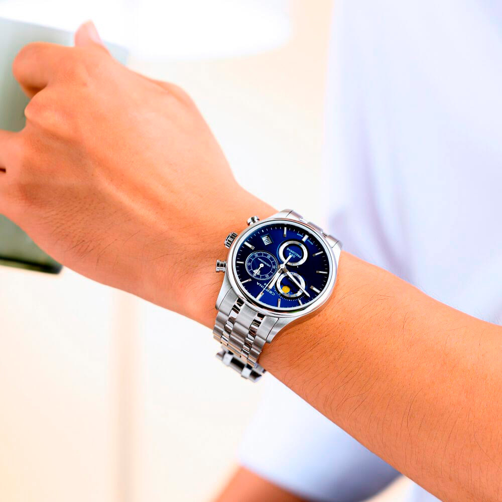 Корпус: Корпус из нержавеющей стали. Синий циферблат с серебристыми стрелками и рисками. Сапфировое стекло с антибликовым покрытием. Диаметр 42 мм. Водостойкость 100 м.