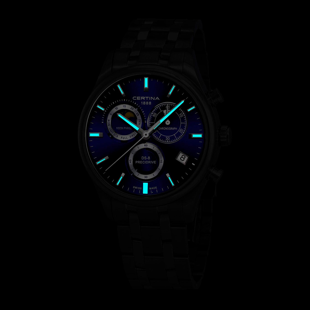 Функции: Индикация часов, минут при помощи центральных стрелок, вынесенная секундная стрелка на "6 часов". Хронограф, индикация фазы луны и лунного цикла, индикация даты .