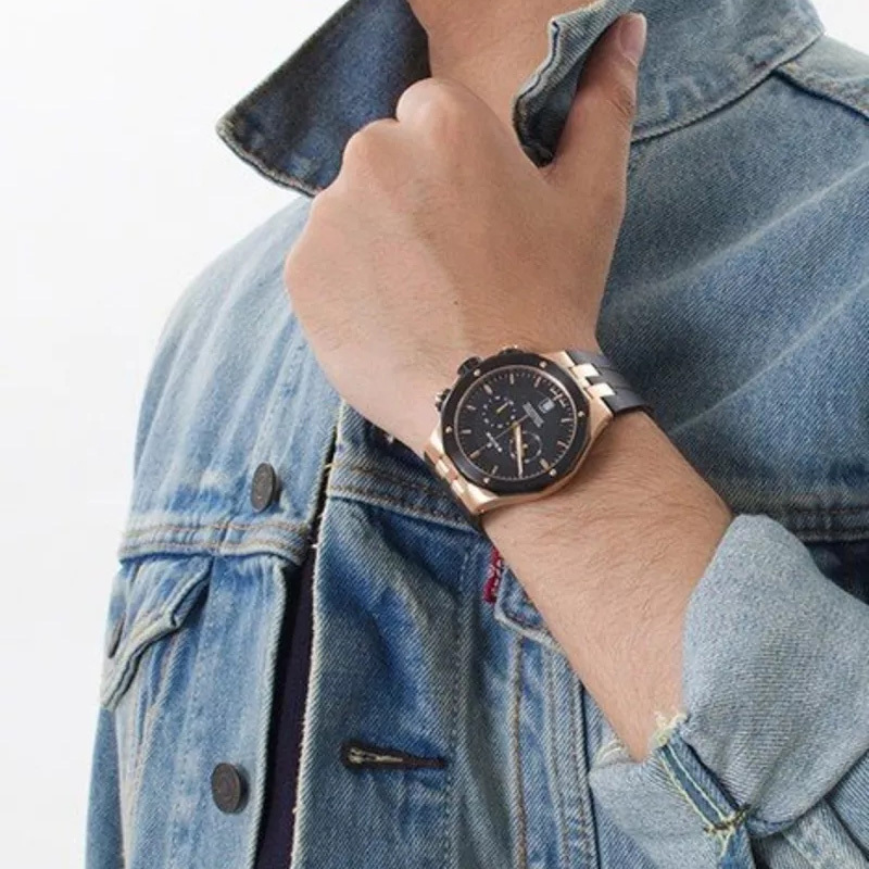 Ремешок: Чёрный каучук с классической застежкой из нержавеющей стали с PVD покрытием цвета розового золота.