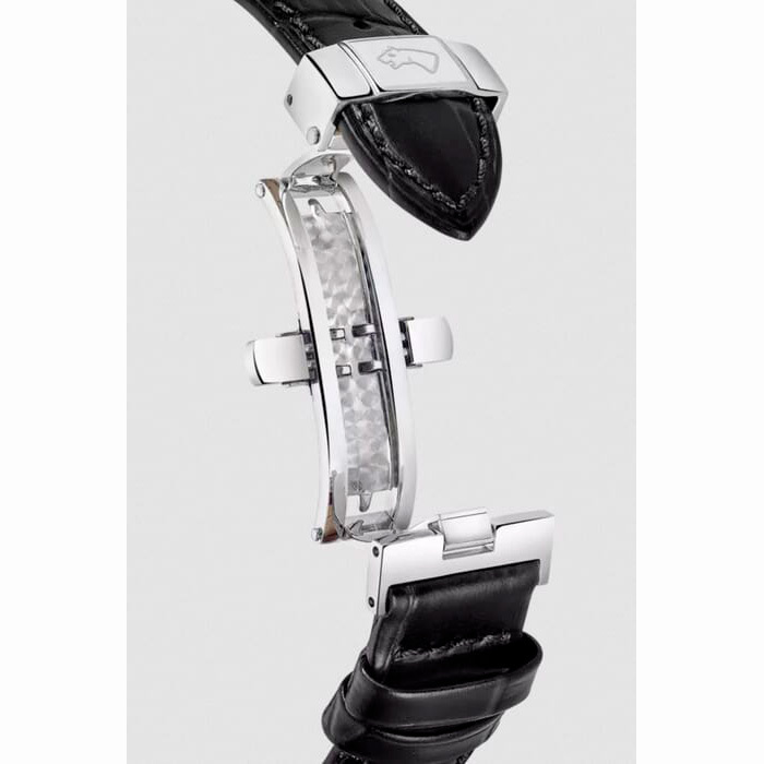 Ремешок: Кожаный ремень чёрного цвета обеспечивает комфортное ношение, застежка гарантирует надёжную фиксацию на запястье.