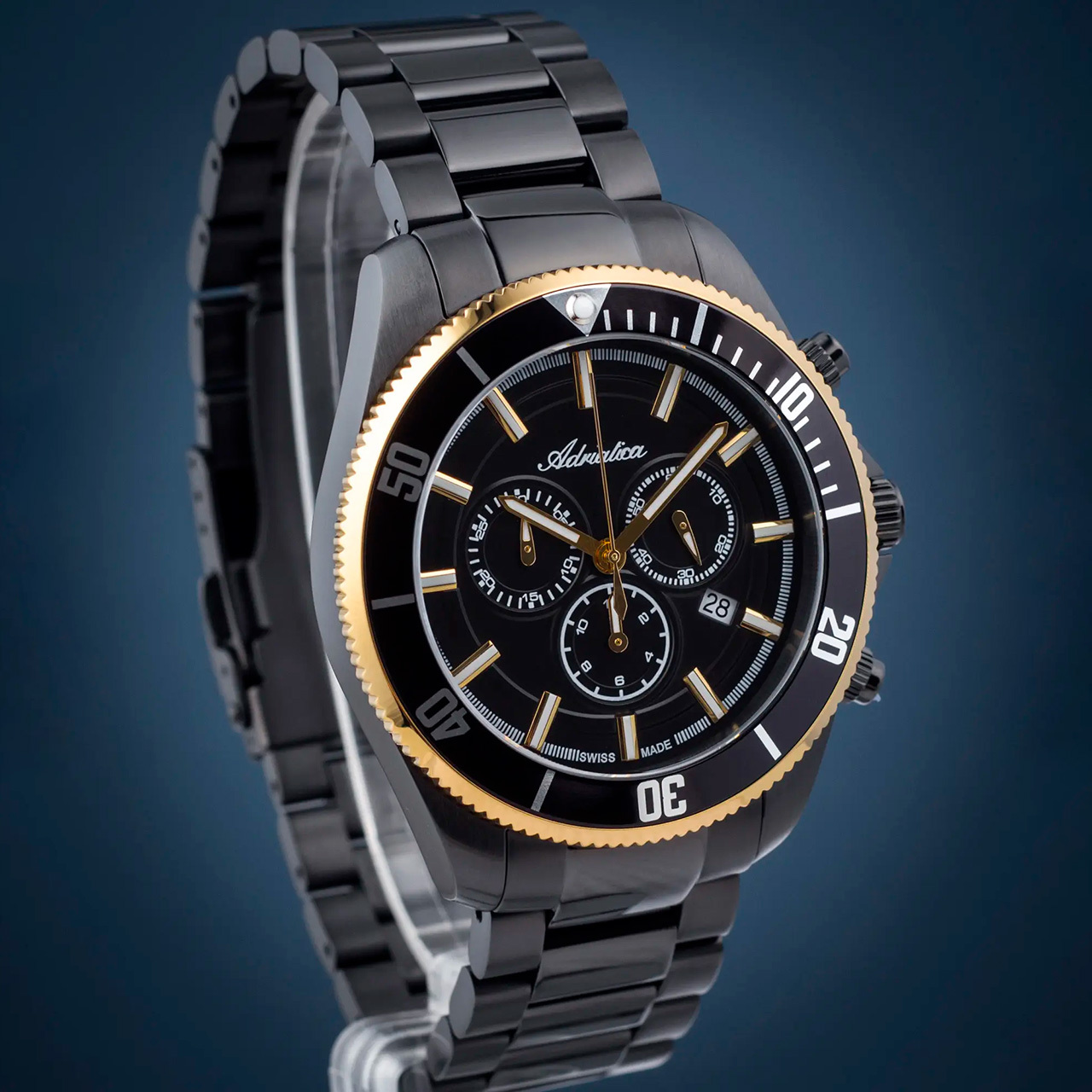 Функции: Центральные часовая и минутная стрелки, секундная стрелка вынесена на отдельный циферблат. Дата. Хронограф.