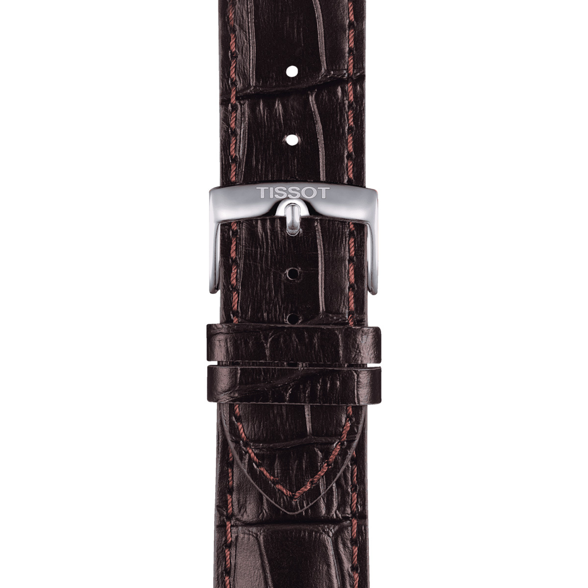 Ремешок: Коричневый кожаный ремешок в стиле аллигатора с классической пряжкой.