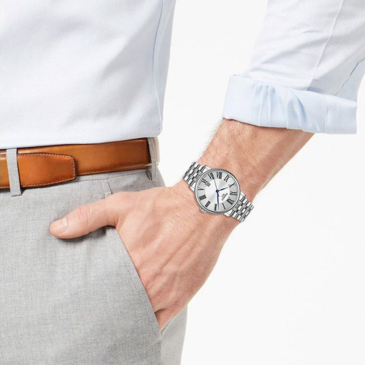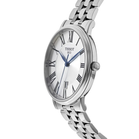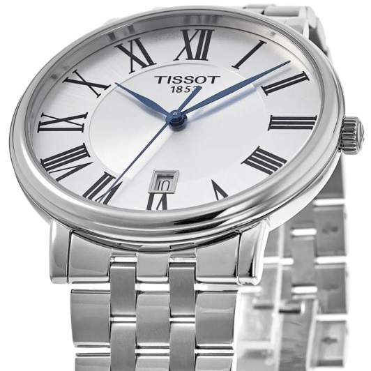 Корпус: Корпус выполнен из высококачественной стали с повышенной устойчивостью к коррозии, поверхности полировкой до зеркального блеска. Циферблат выполнен по технологии Sunray (солнечные лучи) с логотипом Tissot. Узкие листовидные стрелки в стиле Feuille синего цвета и часовые индексы в виде римских цифр чёрного цвета. Сапфировое стекло с антибликовым покрытием, устойчивое к появлению царапин, обладающее высокой прозрачностью. Рифленая заводная головка с логотипом. Диаметр корпуса составляет 40 мм. Водонепроницаемость: 50 м.