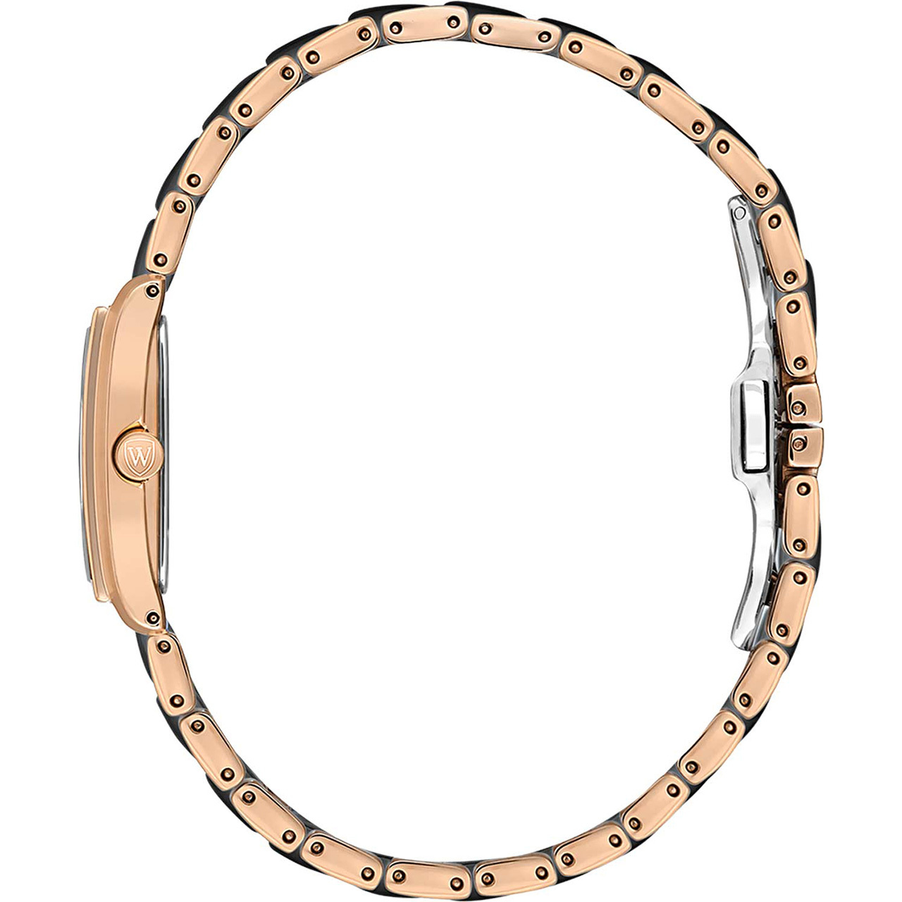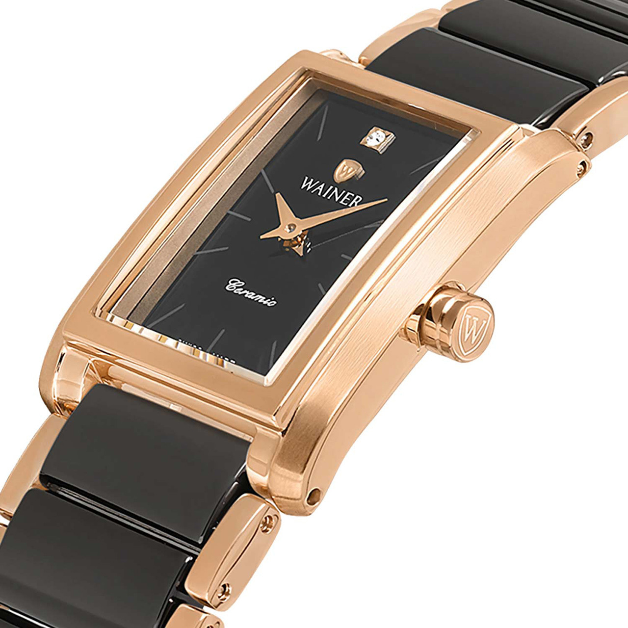 Корпус: Прямоугольный корпус из нержавеющей стали 316L с PVD покрытием цвета розового золота. Циферблат чёрного цвета, защищен устойчивым к царапинам сапфировым стеклом, украшен кристаллом и фирменным логотипом Wainer в положении 12 часов. Рифленая заводная головка с защитой. Размер корпуса 22х24,5 мм, . Водонепроницаемость 30 метров.