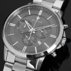 Корпус: Круглый корпус из нержавеющей стали 316L. Циферблат чёрного цвета украшен фирменным логотипом Wainer в положении 12 часов. Метки в виде рисок. Минеральное стекло с сапфировым напылением. Рифленая заводная головка с защитой. Диаметр корпуса 44 мм. Водонепроницаемость 50 метров.