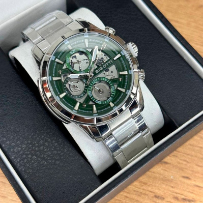 Корпус: Стильные мужские часы со скелетонизированным циферблатом. Корпус изготовлен из латуни и имеет надёжное износостойкое покрытие серебристого цвета. Циферблат зелёного цвета. Часовые индексы и стрелки с люминесцентным покрытием. Прочное минеральное стекло обеспечит защиту часов от повреждений. Диаметр: 44 мм. Водонепроницаемость: 50 м.