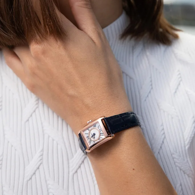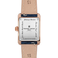 Корпус: Нержавеющая сталь с PVD-покрытием из розового золота. Сапфировое стекло. Элегантный, но четкий циферблат с гильошированным центром защищен сапфировым стеклом, которое максимально устойчиво к царапинам. Элегантность модели усиливают 35 бриллиантов (0,06 карата) на циферблате. Водозащита 30 метров. Размер 23×21 мм.