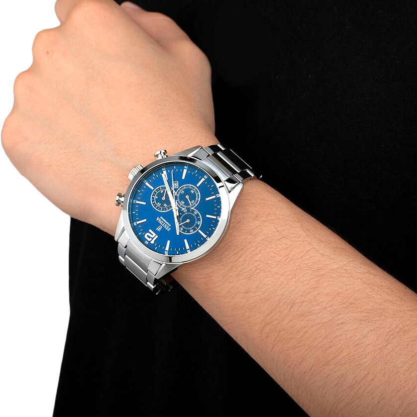 Ремешок: Стальной браслет с раскладывающейся застежкой, которая украшена фирменным логотипом Festina.