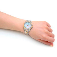 Корпус: Корпус круглой формы выполнен из нержавеющей стали марки 316L. Стойкое PVD покрытие желтым золотом на безеле и переводной коронке. Перламутровый циферблат украшен цирконами. Минеральное стекло. Диаметр корпуса модели составляет 34 мм. Водостойкость 50 метров (5 АТМ).