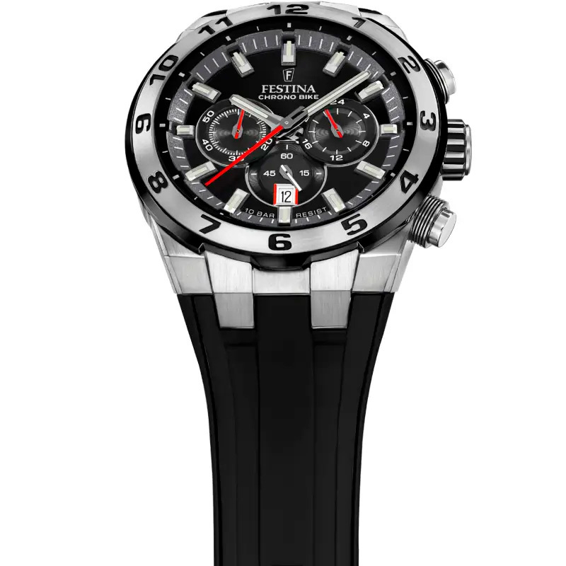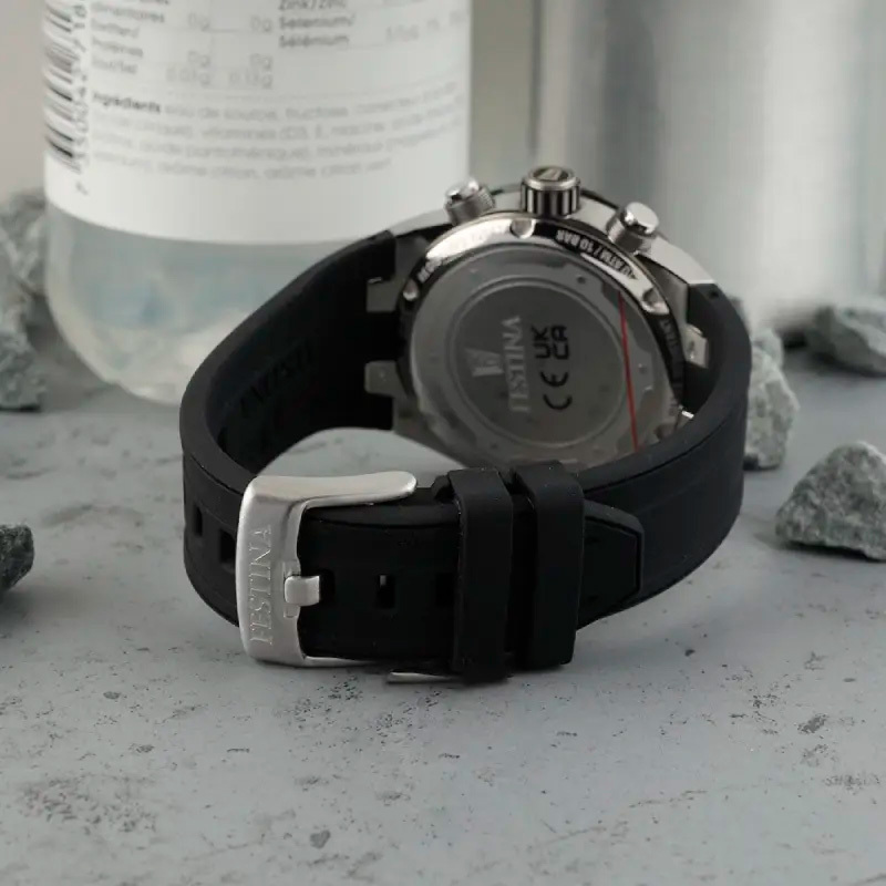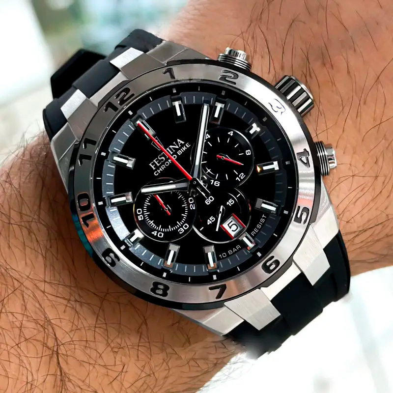 Корпус: Наручные часы Festina в корпусе из нержавеющей стали 316L. Чёрный циферблат защищён от внешнего воздействия минеральным стеклом. Стрелки и метки с люминесцентным покрытием. Рифленая заводная головка. Безель c PVD-покрытием. Водозащита корпуса 10 АТМ позволит плавать, нырять и заниматься другими водными видами спорта. Диаметр 44,5мм, толщина 12,45мм.