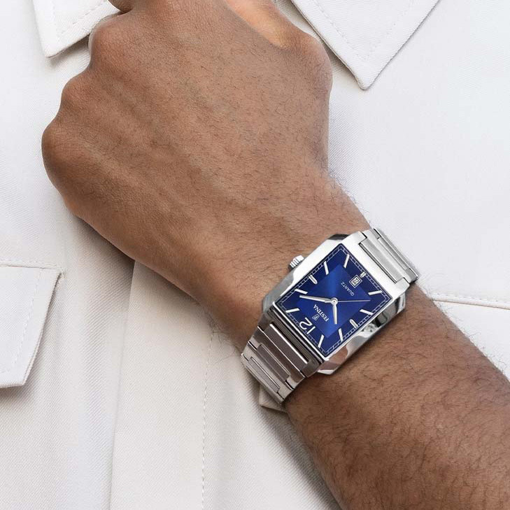 Корпус: Корпус выполнен из высококачественной стали с повышенной устойчивостью к коррозии, поверхность с матовой шлифовкой – сатинированием и полировкой до зеркального блеска. Циферблат синего цвета выполнен по технологии Sunray (солнечные лучи). Накладные часовые метки в виде штрихов, 12-ти часовая метка в виде арабской цифры, стрелки в стиле Baton выполнены из стали. Минеральное стекло защищает циферблат от повреждений. Рифленая заводная головка. Габаритные размеры: