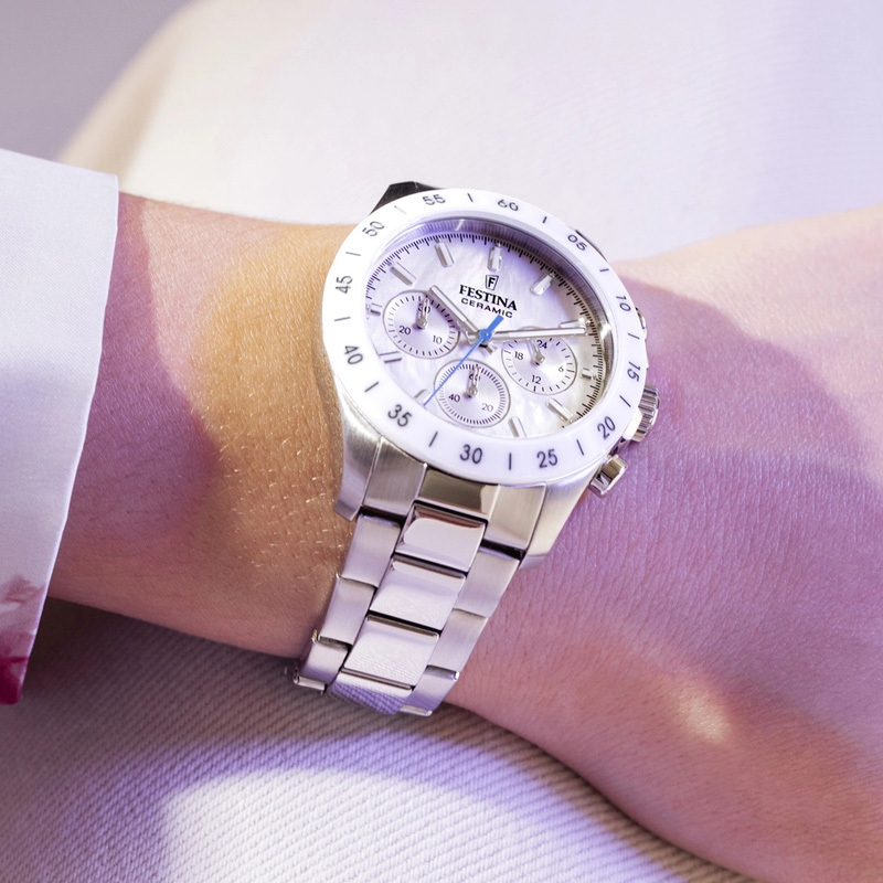 Ремешок: Надежный стальной браслет с раскладывающейся застежкой, которая украшена фирменным логотипом Festina.