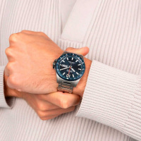 Корпус: Корпус выполнен из титана с повышенной устойчивостью к коррозии, безель с PVD покрытием синего цвета. Циферблат синего цвета выполнен по технологии Sunray (солнечные лучи). Накладные метки в виде штрихов, 12-ти часовая метка в виде арабской цифры, стрелки в стиле Sword выполнены из стали. Люминесцентный состав светящийся в темноте на стрелках и часовых индексах. Минеральное стекло защищает циферблат от повреждений. Рифленая заводная головка. Диаметр: 43 мм. Водозащита: 100 м.