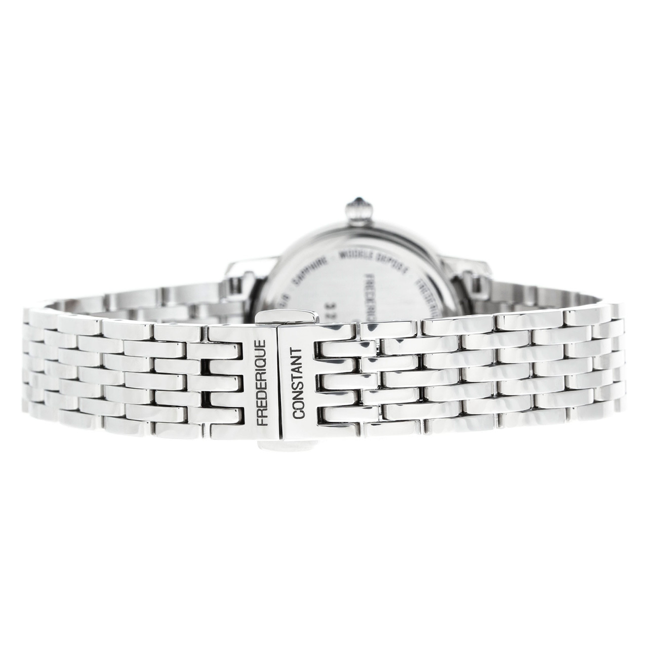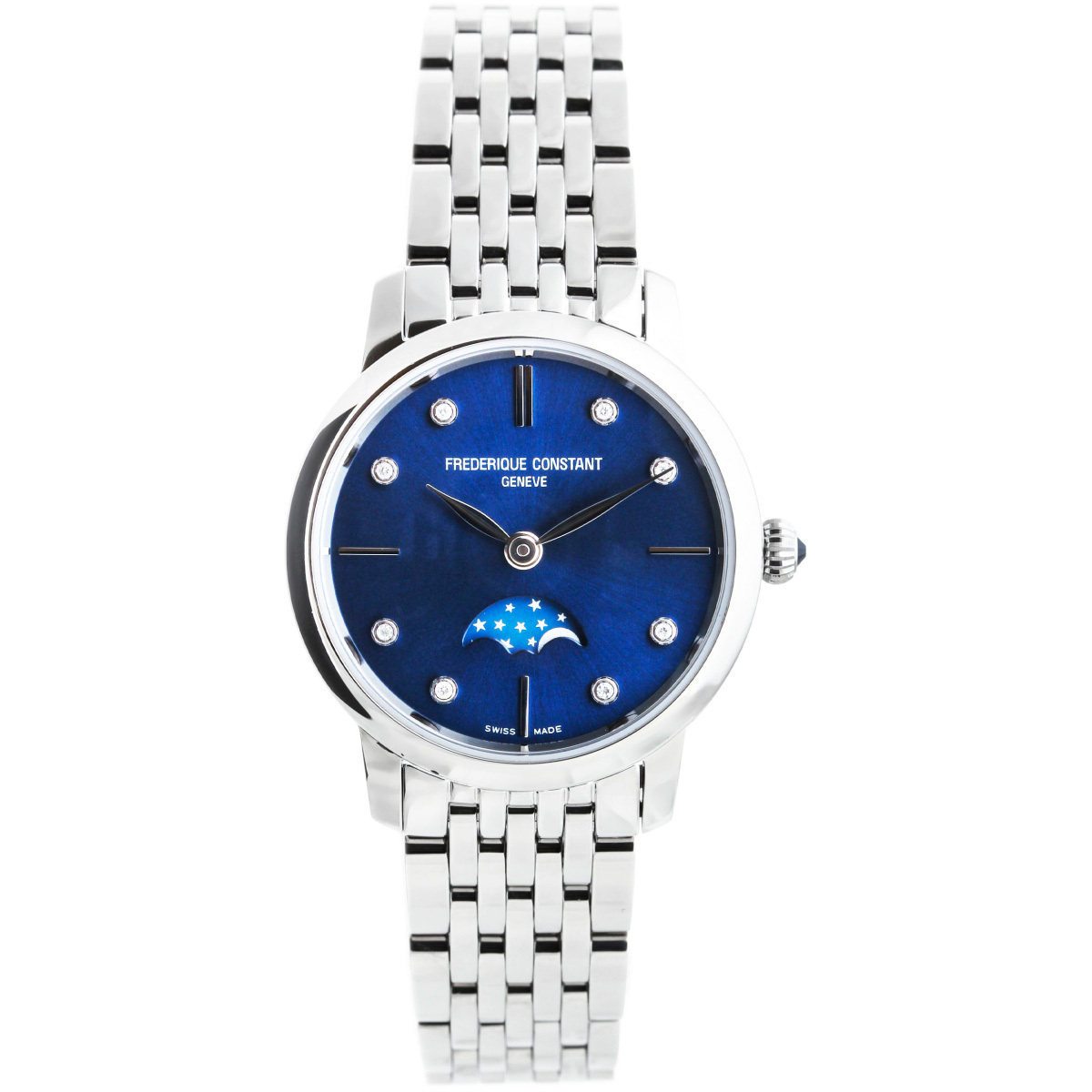 Корпус: Нержавеющая сталь. Циферблат синего цвета, серебристые риски и стрелки, 8 бриллиантов. Сапфировое стекло. Водонепроницаемость 30 метров. Диаметр 30 мм.