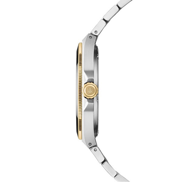 Корпус: Круглый корпус выполнен из стали с частичным PVD-покрытием цвета лимонного золота на кнопках, заводной коронке и безеле. Черный циферблат, позолоченные стрелки и часовые индексы с фотолюминесцентным покрытием. Сапфировое стекло. Диаметр корпуса 41 мм. Водостойкость 100М.