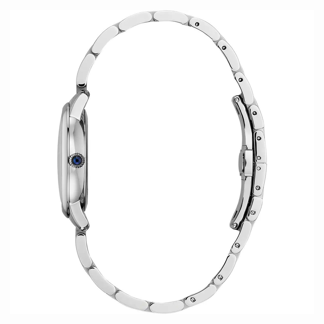 Корпус: Круглый корпус из высококачественной стали, практически не поддающейся коррозии, поверхности с финишной полировкой. На белом перламутровом циферблате вручную установлены 10 бриллиантовых маркеров, и стрелки -”листок” с напылением родия, отполированные вручную. Сапфировое стекло имеет повышенную устойчивость к возникновению царапин. Переводная коронка украшена кабошоном. Задняя крышка захлопывается под давлением. Диаметр корпуса модели составляет: 30 мм, толщина - 7,65 мм. Водостойкость: 30 метров (3 АТМ).