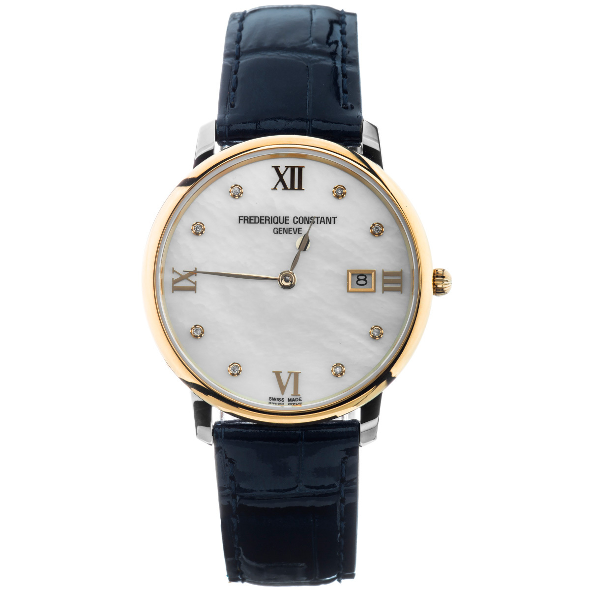 Корпус: Корпус нержавеющая сталь, безель - PVD-покрытие розового цвета. Циферблат белый перламутровый украшен бриллиантами, золотистые стрелки. Сапфировое стекло. Диаметр 36 мм. Водонепроницаемость 30 метров.