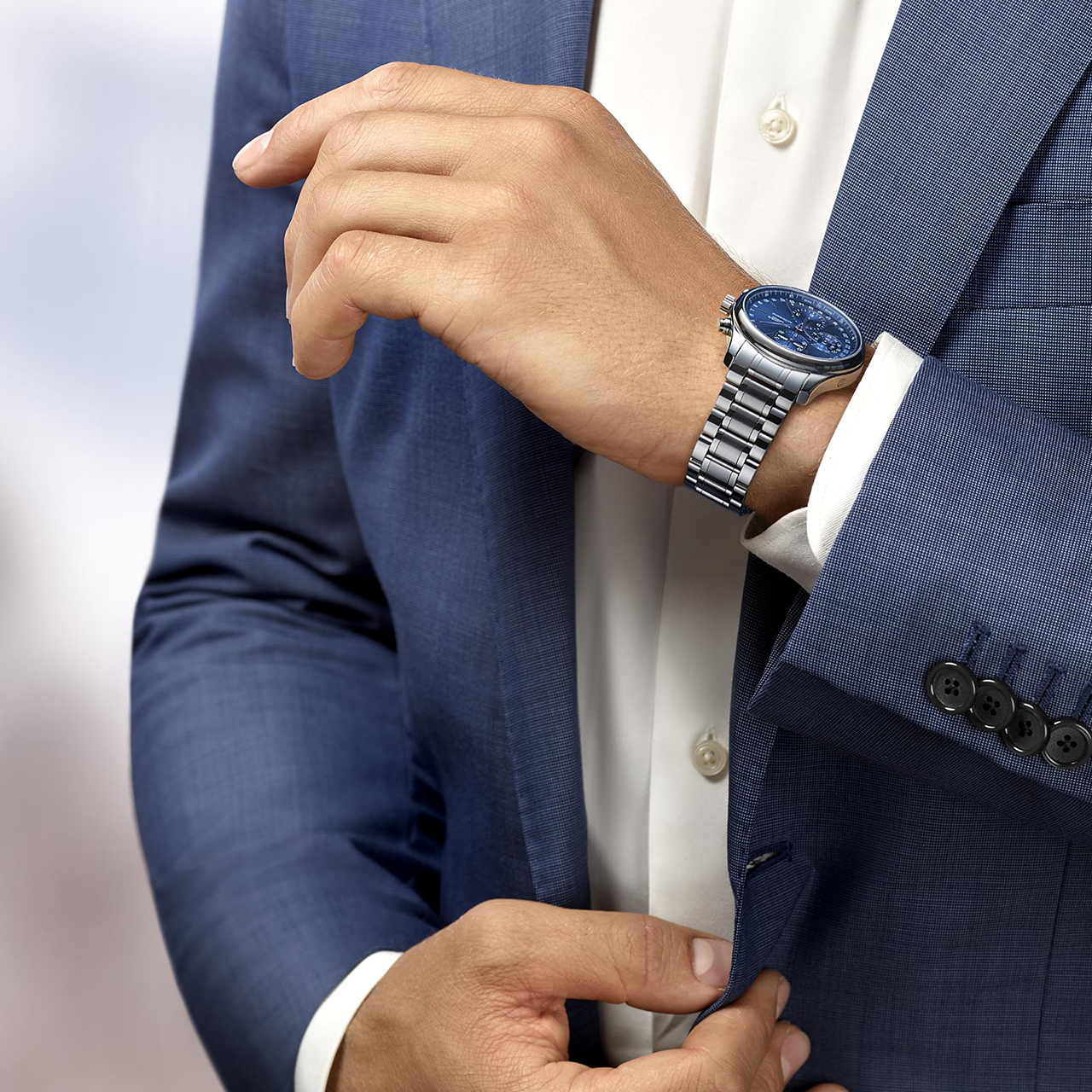 Корпус: Нержавеющая сталь. Синий циферблат. Стрелки и часовые индексы серебристого цвета. Антибликовое покрытие сапфирового стекла позволяет циферблату быть хорошо читаемым и видимым даже в самые солнечные дни. Диаметр 42 мм. Водозащита 30 м.