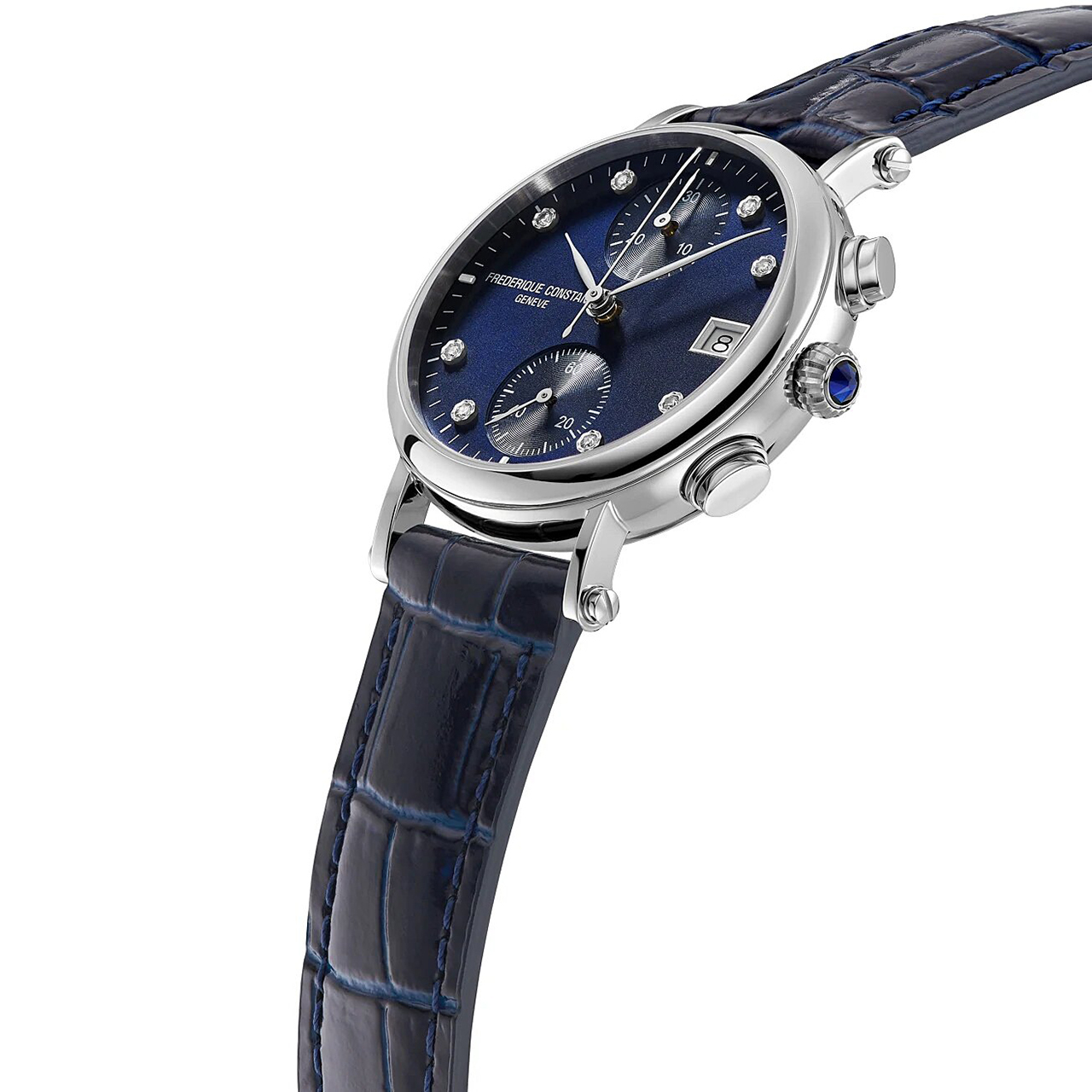 Корпус: Корпус из нержавеющей полированной/матовой стали. Циферблат синий, инкрустирован бриллиантами. Сапфировое стекло с антибликовым покрытием. Диаметр 34 мм. Водозащита 30 м.