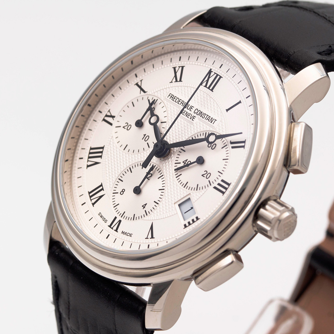 Функции: Индикация часов и минут центральными стрелками. Хронограф с 30-минутным, 12-часовым и центральным секундным счетчиками. Индикация даты на "4" часа, вынесенная секундная стрелка.