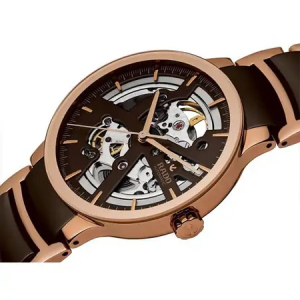 Корпус: Нержавеющая сталь/вакуумное напыление. Крышка корпуса из прозрачного сапфира. Диаметр 38 мм. Водонепроницаемость 30 метров. Циферблат коричневый, скелетированный.