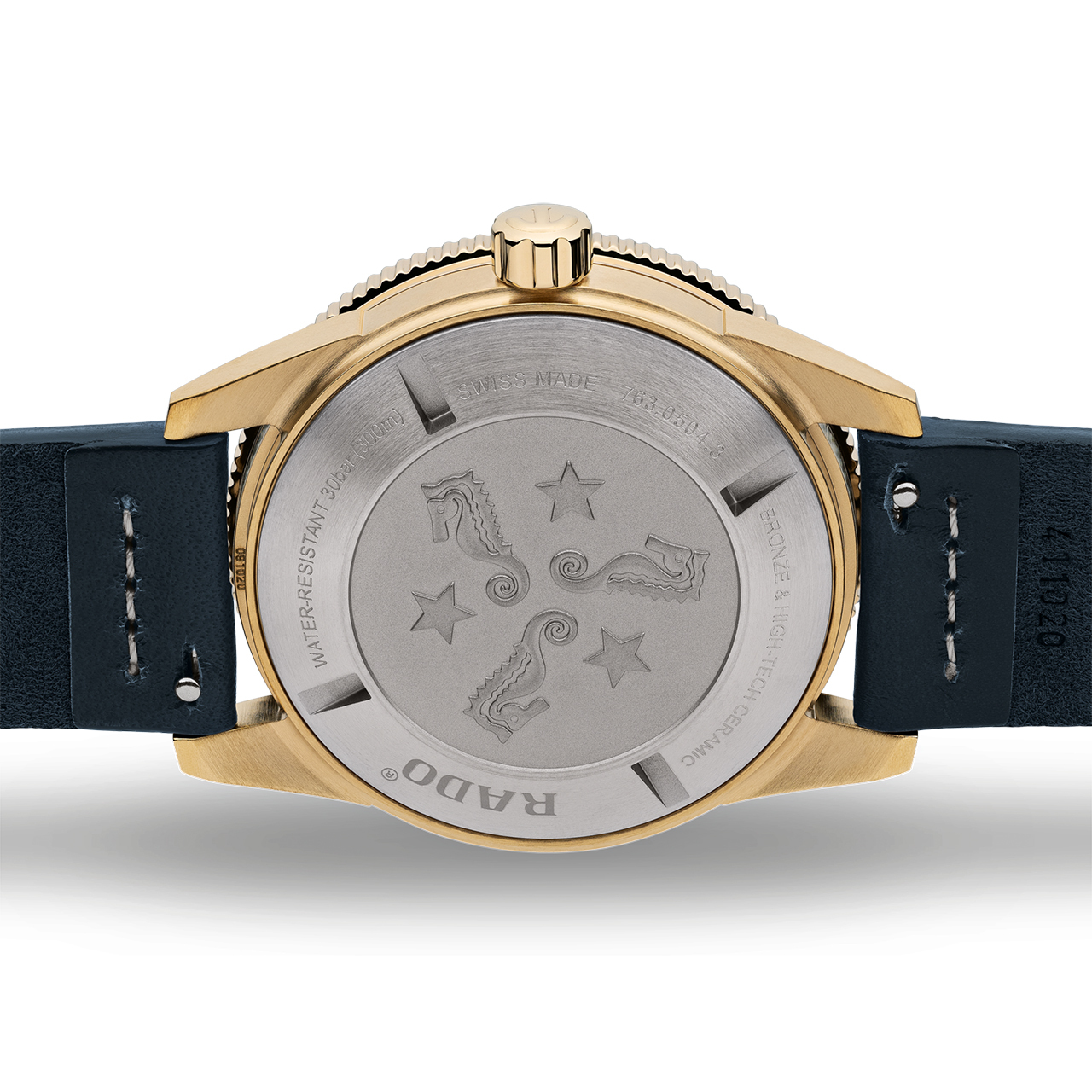 Корпус: Бронзовый. Антибликовое покрытие сапфирового стекла, вращающийся безель со вставкой из высокотехнологичной керамики синего цвета. Синий циферблат. Водонепроницаемость 300 метров. Размер 42 мм.