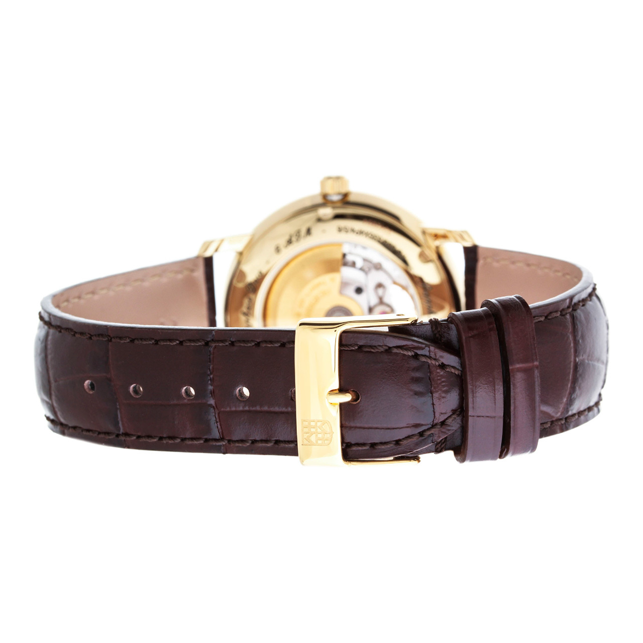Корпус: Корпус выполнен из высококачественной нержавеющей стали с полировкой и матовой шлифовкой (сатинированием) поверхностей. Стойкое к возникновению царапин покрытие цвета желтого золота. Циферблат серебристого цвета с гильошированием в стиле "Clous de Paris", печатные римские цифры и фигурные стрелки черного цвета. Апертура в верхней части циферблата приоткрывает тайну работы часового механизма. Сапфировое стекло с повышенной устойчивостью к появлению царапин. Диаметр корпуса составляет 40 мм, толщина - 10 мм. Заводная коронка украшена логотипом марки. Задняя крышка с прозрачным окном имеет резьбовое соединение с корпусом. Водостойкость 6 АТМ.