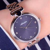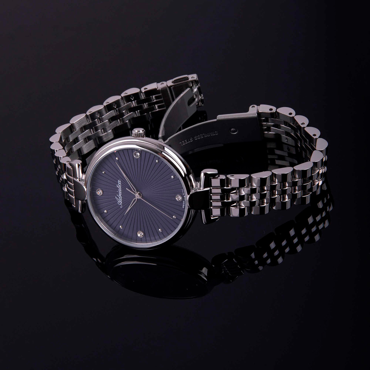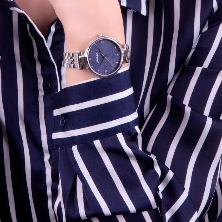 Корпус: Круглый корпус выполнен из полированной нержавеющей стали. Синий циферблат с узором гильоше, украшен 4 кристаллами. Накладные часовые индексы выполнены из стали. Стрелки с покрытием SuperLuminova, которое обеспечивает подсветку в темное время суток. Минеральное стекло. Диаметр корпуса составляет 35 мм, толщина 8 мм. Водостойкость WR 30 (мытье рук, дождь).