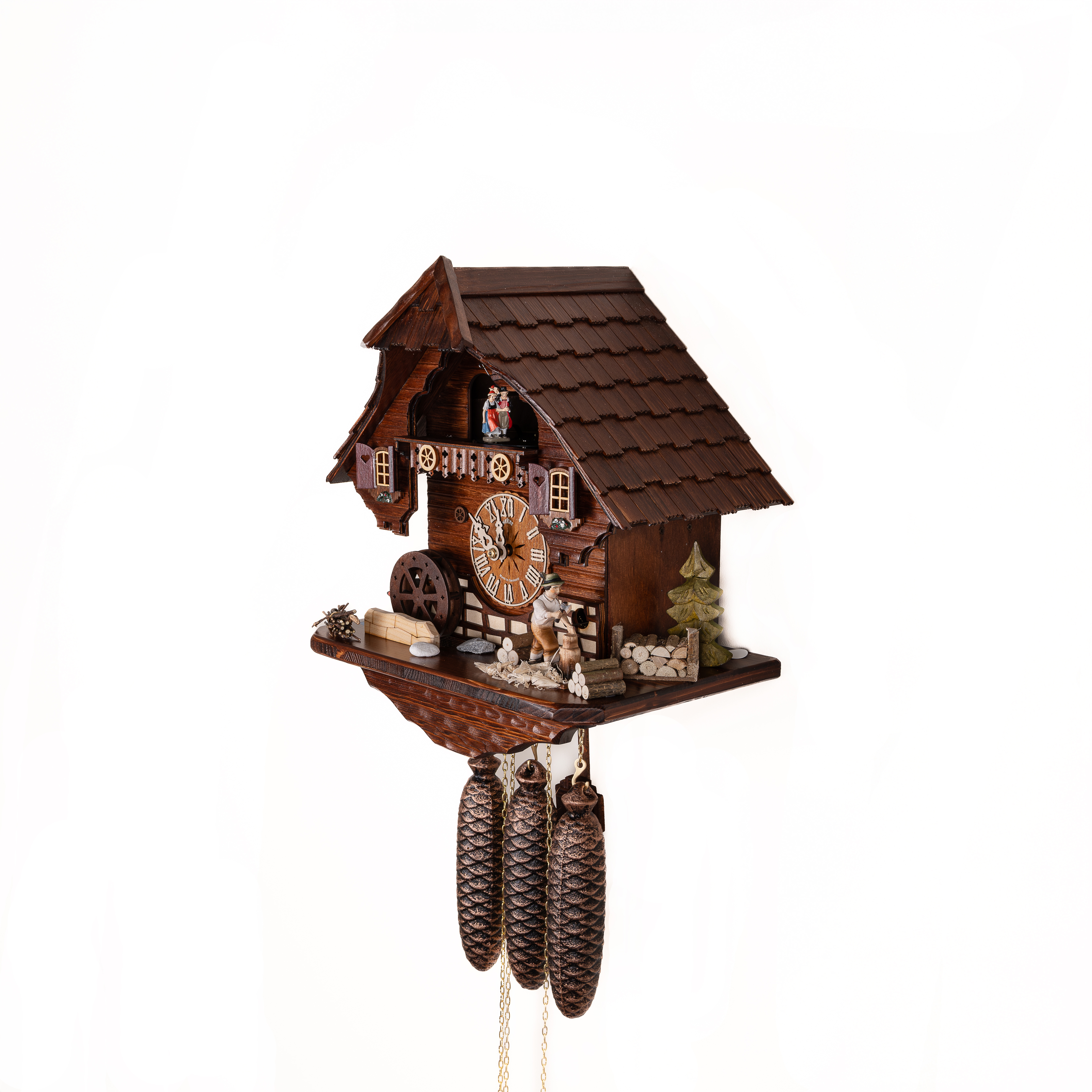 Материал: Натуральное дерево. Дом в стиле Шале. Декоративная резьба. Деревянная черепица. Деревянный циферблат часов. Деревянная кукушка. Движущиеся элементы-танцоры, лесоруб и мельничное колесо.