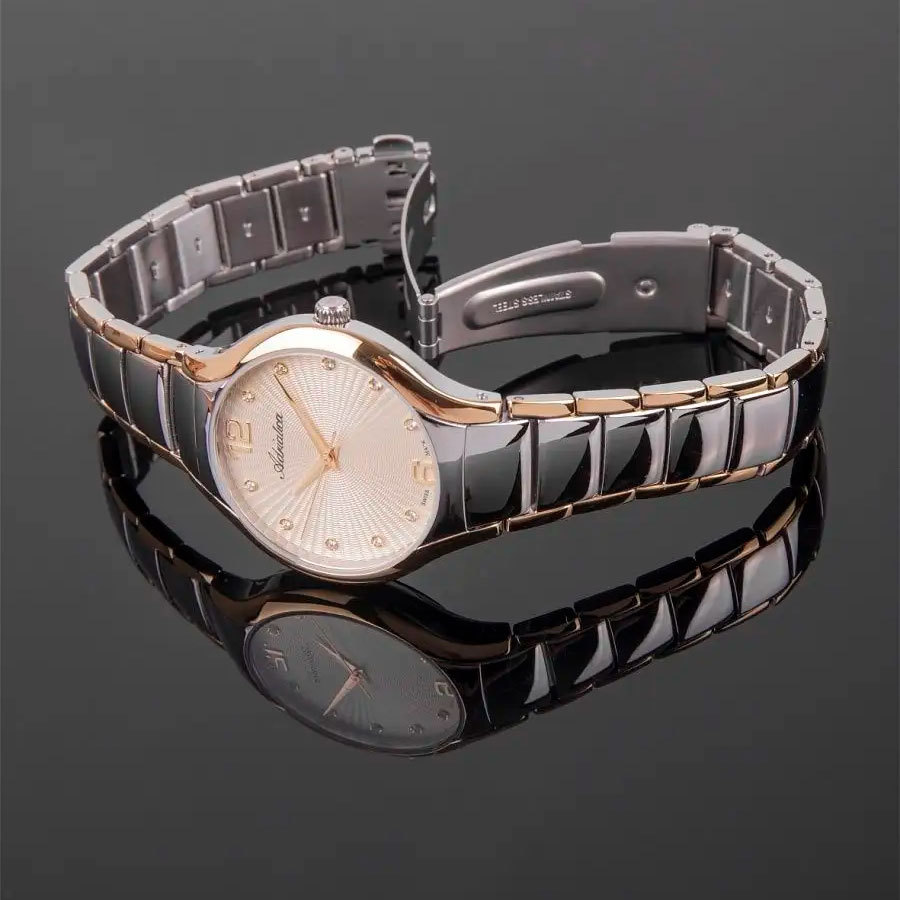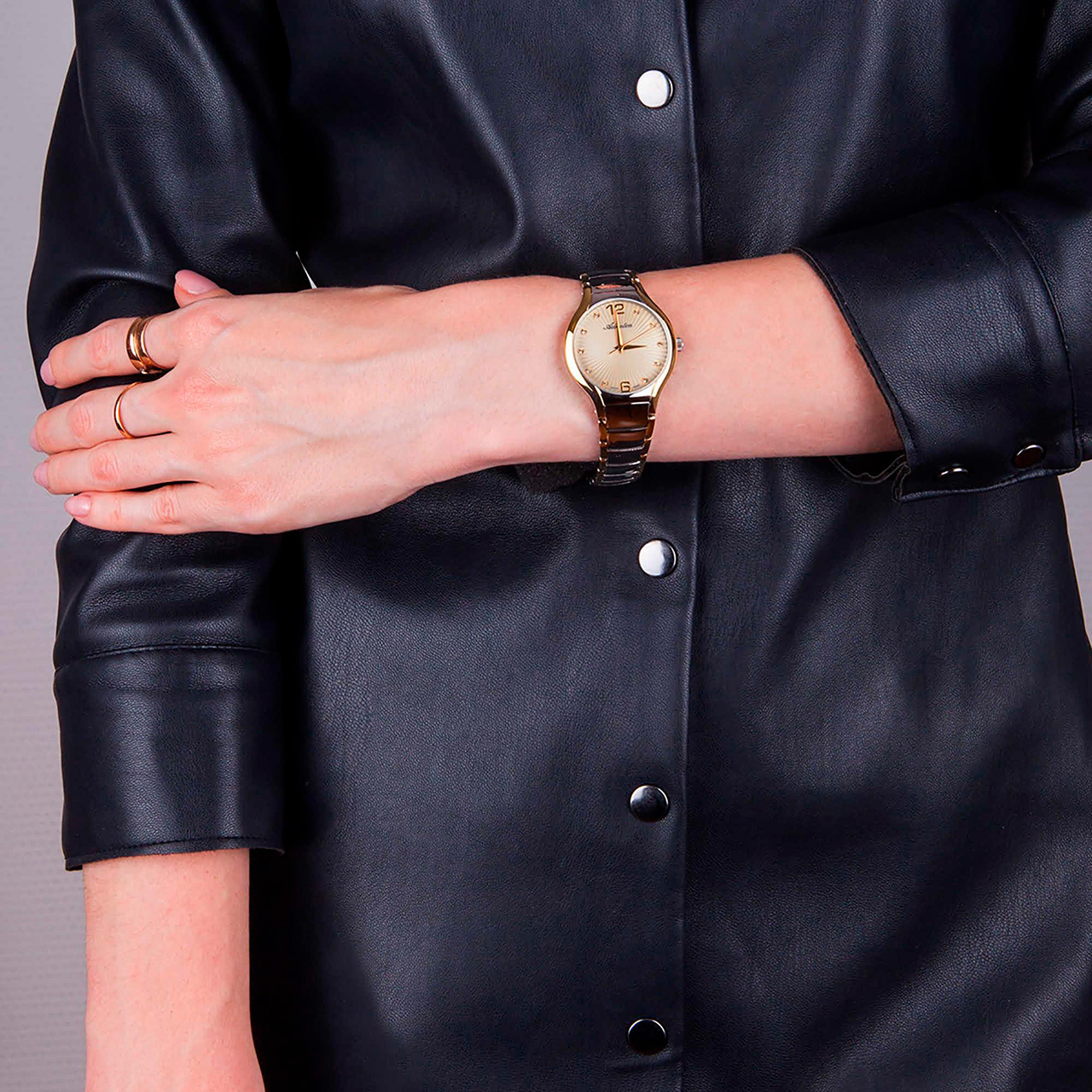 Корпус: Круглый корпус выполнен из полированной нержавеющей стали с PVD покрытием желтого золота. Циферблат цвета шампань украшен 10 цирконами. Минеральное стекло с сапфировым покрытием. Диаметр корпуса составляет 33 мм, толщина 7 мм. Водостойкость WR 30 (мытье рук, дождь).