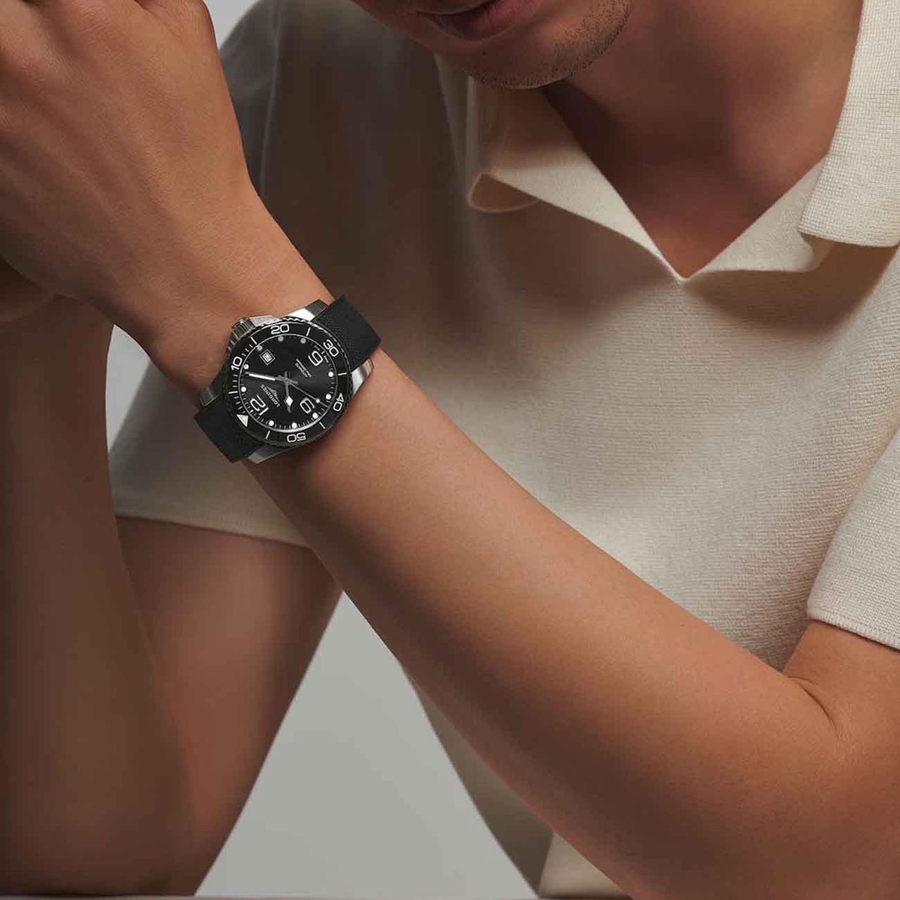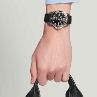 Корпус: Корпус из нержавеющей стали. Черный циферблат. Сапфировое стекло с антибликовым покрытием. Завинчивающиеся задняя крышка и заводная головка. Однонаправленно вращающийся безель из керамики. Диаметр 41 мм. Водозащита 300 м.