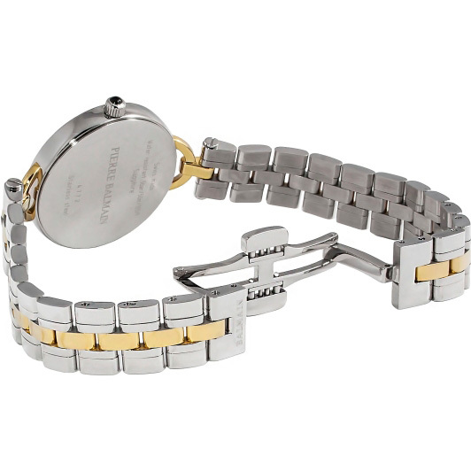 Корпус: Нержавеющая сталь и PVD-покрытие из желтого золота, сапфировое стекло. Циферблат белый перламутровый с позолоченными стрелками и часовыми индексами. Диаметр 32 мм. Водонепроницаемость 50 метров.